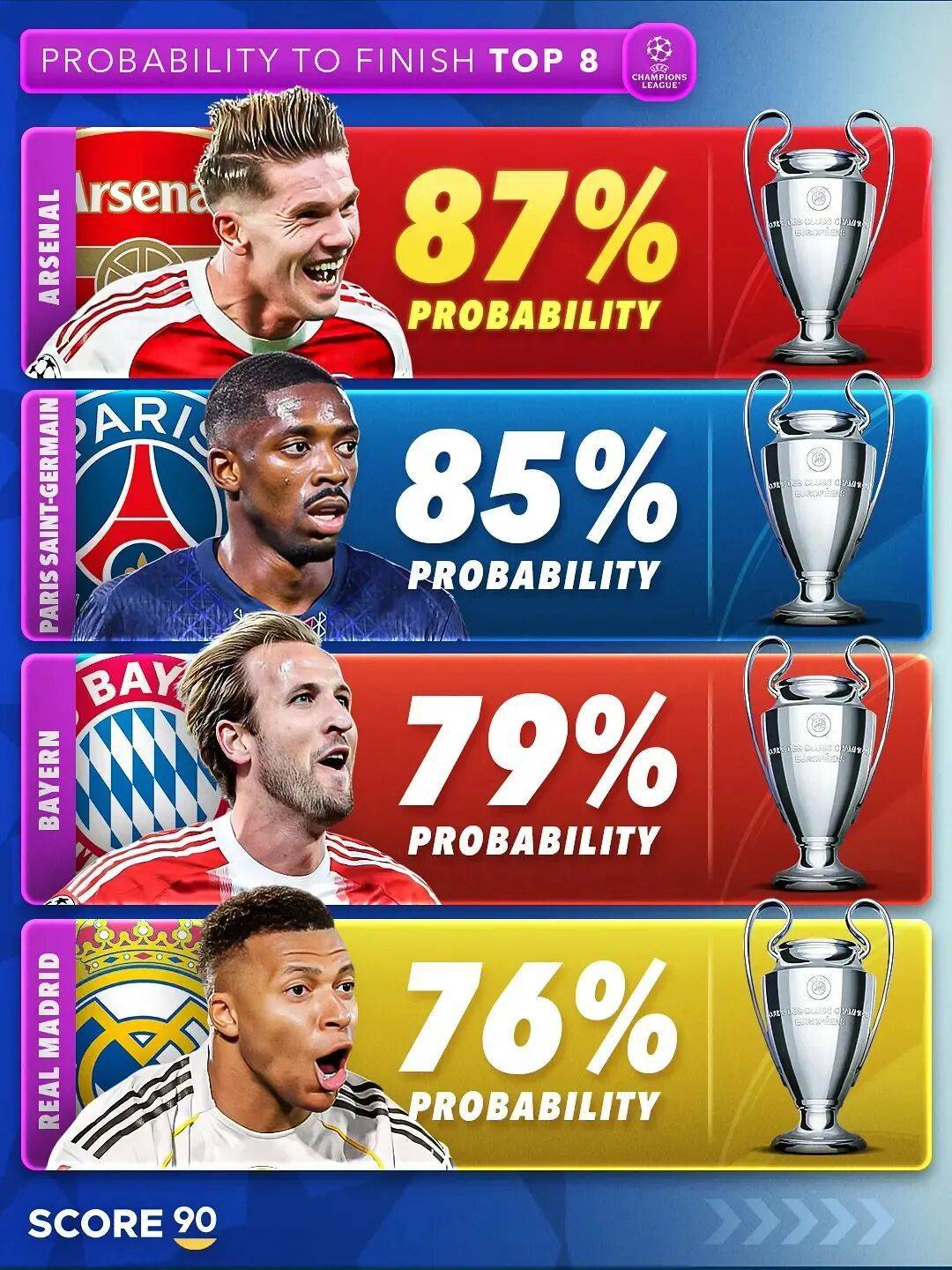 积分榜从榜首开始到第五,依次是巴黎、拜仁、国米、阿森纳和皇马,对应的分别是法甲、德甲、意甲、英超和西甲。